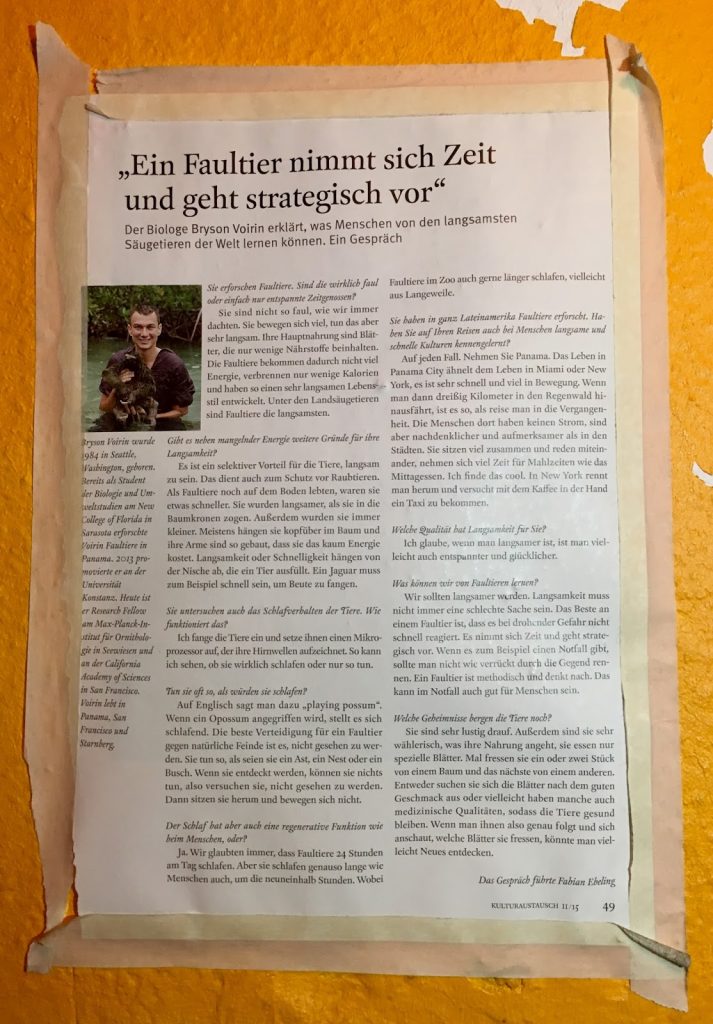 Ein microblogging-wertes Interview – entdeckt auf dem Klo meiner Schwägerin – mit dem Faultierforscher Bryson Voirin. Voirin teilt schöne Ansichten über das Leben – an sich keine Neuen – aber dank dem Kontext Faultierforschung mit umso einleuchtenderem Witz: